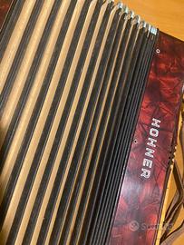 Fisarmonica vintage anni ‘60 marca Hohner modello Verdi II a 34 tasti con cinghia in pellecolore bordeaux marmorizzato