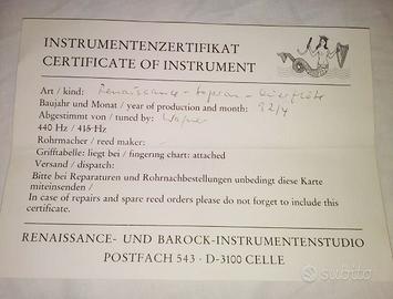 Flauto traverso barocco rinascimentale in legno d'acero, accordato 440 Hz (verificato tuner) ,6 fori. Prodotto in Germania nel 1992, acquistato nuovo nel 1996.