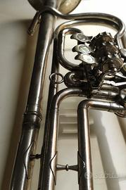 Flicorno "genis" vintage della prima metà del novecento della premiata fabbrica Desidera, fornitore regio esercito, alcune ammaccature (visibili sulla campana) e normale usura del tempo. È saltata la saldatura della struttura di pulsantiera, ma ripristinabile. Pulsanti in madreperla.