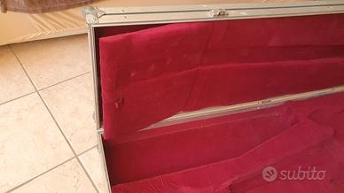 Case di legno interamente profilato in alluminio,con cerniere e serrature robuste.L'interno è imbottito e sagomato , con un ampio cassetto per corde,cavi,accordatori e accessori vari . Misure interne: 118x36 cm e quelle esterne: 122,5x39,5x13,5