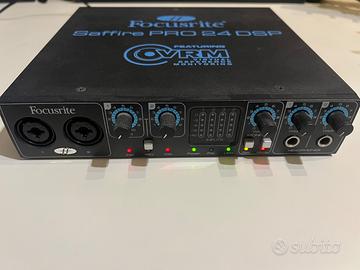 La Focusrite Saffire PRO 24 DSP è un'interfaccia audio Firewire 16 in / 8 Out dotata di soluzioni per la registrazione e per il missaggio alimentate in real-time da un proprio DSP, pensata per l'ambiente del moderno home studio. Oltre alla compressione ed alla equalizzazione utilizzabili senza latenza in registrazione, e ad un comodo riverbero, è dotata anche di VRM, una tecnologia di monitoraggio virtuale che vi permette di sentire il vostro mix simulando diversi ambienti, diverse casse e da diverse posizioni, il tutto utilizzando semplicemente le vostre cuffie. La Saffire PRO 24 DSP combina due preamplificatori Focusrite ed altri ingressi/uscite con particolari soluzioni di elaborazione professionale ed un software di controllo facile da usare. Insieme offrono la più completa e compatta interfaccia professionale per la registrazione musicale presente oggi sul mercato.