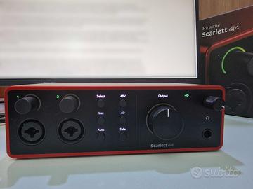 Vendo interfaccia audio Focusrite Scarlett 4i4 di QUARTA GENERAZIONE (modello attualmente in commercio), acquistata il 14/02/2025 presso StrumentiMusicali.net. La scheda è stata utilizzata solo per brevi test con master keyboard Roland A49 e Ableton, poi riposta nel suo scatolo originale. È esteticamente e funzionalmente perfetta. Garanzia Residua: Prodotto acquistato meno di un anno fa, gode della garanzia ufficiale di 3 anni (fino al 14/02/2028). Condizioni: Completa di scatola originale, cavetteria e tutta la documentazione. Foto reali del prodotto Caratteristiche principali della 4th Gen: Convertitori professionali serie RedNet (120dB di gamma dinamica). Funzioni Auto Gain e Clip Safe per registrazioni perfette al primo colpo. Modalità Air riprogettata per un suono più ricco. Disponibile per qualsiasi prova. Scambio a mano in zona o spedizione tracciata con imballo accurato.
