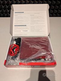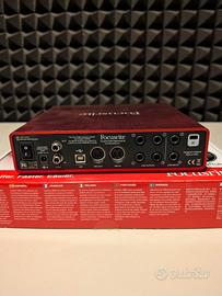 6 ingressi / 6 uscite, preamplificatori Focusrite cristallini, due ingressi combo XLR/Jack sul pannello frontale, pad e phantom power 48V, MIDI In/Out, connessioni line e S/PDIF, uscita cuffie indipendente.