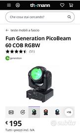 Vendo ultima coppia di Teste mobili Fun Generation PicoBeam 60 COB RGBW "EX DEMO" esposte solo in negozio quindi pari al nuovo complete di accessori. Ritiro in zona Caserta città eventuale spedizione a vostro carico prezzo non trattabile.