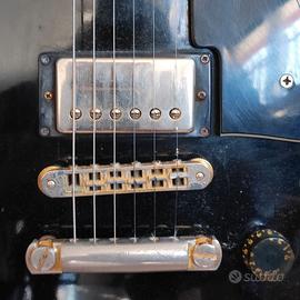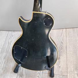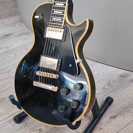 Chitarra elettrica Gibson Les Paul Custom (Black Beauty) seriale 80481605 , prodotta a Nashville nel 1981 forse il 17 febbraio. Corpo nero con binding multiplo su top e retro: tipico della Les Paul Custom. Tastiera con intarsi “block” in madreperla. Logo Gibson “split diamond” sulla paletta: classico delle Custom. Hardware dorato (parzialmente usurato): segno di una versione Custom di fascia alta. Due humbuckers con copertura cromata. Manopole “speed” nere: classiche degli anni ‘70 e ‘80. Custodia originale Gibson vintage (probabile anni ‘70-‘80). Chitarra usata suonata da musicista professionista, ferma da tempo ma in buona conservazione. Custodia originale ma in conservazione mediocre
