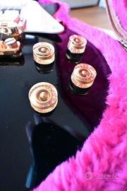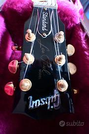 Gibson Les paul standard ebony 1998, Usata pochissimo, hardware dorato, meccaniche glover, certificato di garanzia made in usa, custodia integra con mantello macchiato da birra (vedi foto). Qualche graffio, vernice con segni di leggerissima crepatura zona potenziometri. Paletta con segni zona meccanica come da foto. Adesivi facilmente rimovibili. disponibile per prova a sesto fiorentino. Prezzo poco trattabile. Spedizione su richiesta ma considerando l'oggetto preferisco consegna a mano.Vendo per inutilizzo