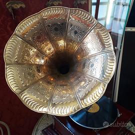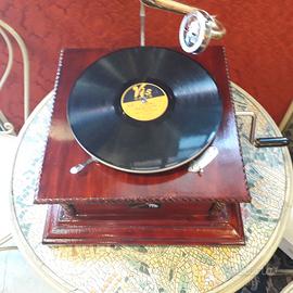 Vendo Grammofono in legno con tromba in ottone. Marchio His Master' s Voice. Per arredare con classe un ristorante, una vetrina, un negozio per tenerlo sopra un mobile, per usi scenografici. La cassa è in legno di mogano laccato, funziona a manovella e si può regolare tramite una leva la velocità del disco (78 giri). Le misure sono 37 x 37 cm con manovella sommare 9 cm, altezza con tromba 70 cm.