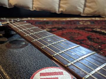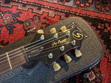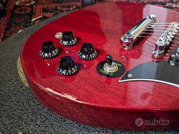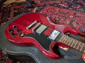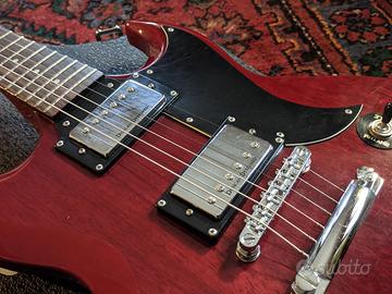 Vendesi Greg Bennett TR1 prodotta da Samick su base SG in buone condizioni, con lievi difetti estetici tra cui un piccolo bordo sbeccato visibile in foto. Fret sani e ottimo suono grazie a pickup Duncan design. Dotata di corde nuove Roto R10. Inclusa custodia Warwick rockbag deluxe.