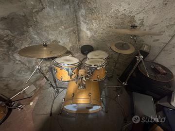 cassa da 22x18 con pedale e battente DW 3000, rullante 14x5,5 , 2 tom 10 e 12, 2 timpani 14 e 16, asta HH YAMAHA con piatti T-Alternative da 14, asta Dixon e Crash T-Classic Light da 17 e Ride T-Classic Light da 21 con asta YAMAHA,
