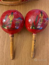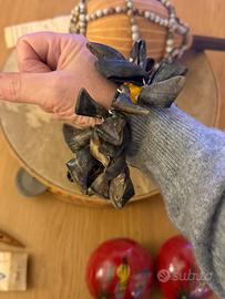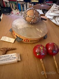 Gruppo di strumenti musicali, tra cui un tamburo calabrese, maracas etniche ocarina di Budrio originale, bracciale con pezzi che sembrano denti di squalo che fanno ritmo e altro elemento ritmico sempre etnico