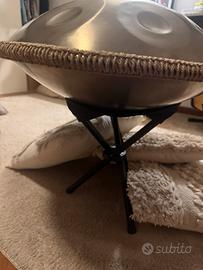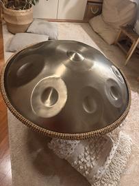 Hand Pan Casia praticamente nuovo Kurd 10 note RE minore Accordato a HZ440 NOTE: D3 Centrale/ D3/ Eb3/ F4/ G4/ A4/ Bb4/ C4/ D4 Caisa Drum, Hang Drum, Sonido, Disco Armonico,Steel Drum, HandPan, Metal Drum, Caisa pan, Bellissimo strumento a percussione, Tamburo armonico Su una laminato di acciaio dorato sono ricavate 10 note Misure del disco: larghezza cm.56 (22") spessore cm.24 Peso Kg.4 Tonalità RE minore pentatonico