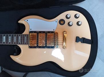 Vendo Harley Benton double cut simil SG diavoletto DC-600 VI + custodia semi rigida sagomata Harley Benton Light Case DC El-Guitar e meccaniche autobloccanti Musiclily stile vintage. Regalo tracolla DiMarzio clip lock.