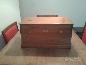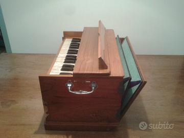 Harmonium in legno con tasti madreperla. suona azionando il mantice.