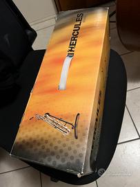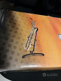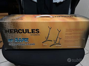 Il supporto per sassofono baritono HERCULES DS535B presenta il giogo pieghevole, la regolazione dell'altezza della leva, lo schienale regolabile e le gambe girevoli.