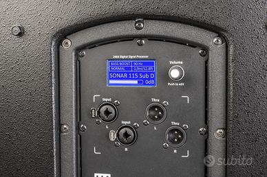 Potenza: 1500W di picco Amplificatore: Classe D SPL max: 128dB Risposta in frequenza: 36Hz - X-Over Ingressi: 2 XLR/jack combo bilanciati Uscite: 2x XLR bilanciati thru Display LCD Cabinet: Legno Dimensioni: 430 x H612 x 616mm Peso: 26,4kg Colore: Nero