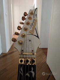 Corpo sagomato in Ontano e un manico 5 pezzi acero e noce bolt-on. Tastiera in ebano 24 tasti ornata con l'intarsio "Albero della Vita" su manico veloce tipo Wizard di Ibanez. Pickup: DiMarzio Evolution (HSH). Tremolo tipo Floyd Rose: Edge dorato con leva Ultralite. Hardware: Dorato. Colore: Bianco Custodia: Gig Bag Ibanez inclusa.