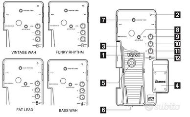 IBANEZ Wah-Wah "WD7" (Weeping DEMON) usato poco, modalità a molla (auto-off) o normale (vedi selettore nella foto con freccia rossa). Controlli per Range (frequenza), Level, Low e Fine per il suono; Importante: regolazione della tensione meccanica della molla. È alimentabile via batteria 9V (vedi alloggio separato con coperchio a scatto) o alimentatore 9V (NON compreso) attivandosi all'inserimento del jack input. Dispone di selezionatore per la gamma delle frequenze su cui agisce il pedale wah (cambiare timbrica) • NORMAL : Wah convenzionale (chitarra) • LOW: Wah di gamma bassa (basso) o chitarra a 7 corde baritonali (ecco uno dei motivi del suo aspetto e per i quali è considerato un wha wha "metal", ma nel setup tradizionale va bene per qualsiasi genere). Chassis in metallo, ottime condizioni, occhio al peso: 1,5kg è davvero stabile nell'uso e bello massiccio. Posso concordare la consegna anche di persona -se possibile- zona Sud Sardegna altrimenti spedizione.
