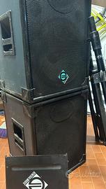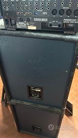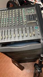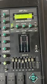 impianto audio amplificato 12 canali con DSP per reverbero voce con piantane in alluminio per casse. Presenta piccoli segni dovuti all'usura e piccolo difetto sulla seconda riga del display