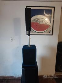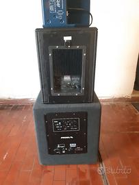 Sistema line array attivo, scocca in legno modello db technologies es 602, assemblato amplificatore finale proel smart 12 a da 200 watt RMS per il cono woofer midrange da 10 pollici, 50 watt RMS per la parte degli alti, ingressi jack canon xlr, cavo speakon con filtro cross over interno per amplificare la parte degli alti.