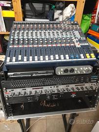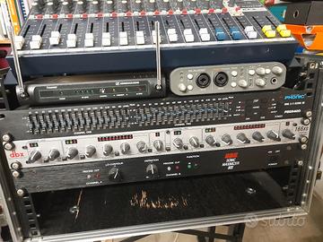 Vendo impianto completo come da foto,composto da: Mixer Soundcraft Efx 12,Equalizzatore PhonicPEQ 3400,Compressore DBX 166 xs,Effetto voce BBE Sonic Maximer 322,Radiomicrofono Sennheiser Freeport, Flightcase Bespeco, Supporto Mixer Millenium ( esclusa M audio nella foto).Tutto perfettamente funzionante, già cablato e pronto all'uso .Vendo anche pezzi separati.Spedizione a carico dell'acquirente.No perditempo, no permute.