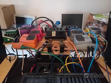 Impianto audio usato in Studio privato come nuovo, di cui composto da ; 2 casse amplificate a 2 vie marca TASCAM da 90 watt la coppia , dispone di. Radio trasmettitori per applicazioni wireless senza cavi , le casse possono essere usate anche senza Mixer o in modalità Computer ... le casse non dispongono di Stativi a supporto regolabili in altezza ma è possibile aggiungere un supporto esterno per stativi. Mixer pari al nuovo marca FOSTEX - 28 vecchio modello a 4 piste di registrazione a nastro (cassette) di cui 10 canali totali Audio DIREZIONALI (destra sinistra centro) audio regolabili nella direzione desiderata con PAN per ogni singolo strumento o effetto ... nelle registrazioni è possibile sovrapporre altre incisioni ausiliari a completare il brano tramite ingressi dei restanti canali ... inoltre si possono preparare incidere brani registrati utilizzandoli come BASI o Performance per suonarci sopra in musica LIVE. Nell'impianto sono compresi 3 ingressi per telefono cellulare per connessioni internet + 3 radiotrasmettitori funzione totale Live in wireless senza cavi, 5 miniamplificatori 4 uscire cadauno in Stereo (utile per suonare con un solo strumento ed ottenere da 1 a 12 unità che suonano in tempo reale contemporaneamente dal medesimo strumento con effetti individuali differenti ) , 8 effetti a pedale programmabili anche senza adoperare il piede, Vocalist Digitech coro a 5 voci usato poche volte ( sempre rimasto fisso nel REC) con pedaliera PROEL Midi. .... inoltre è compreso un multi effetto - multistrumenti MOOER P- 100 con accordatore incorporato e PACK percussioni regolabili per ogni tipo di brano. Tutto quanto sopra indicato .... compreso cavi e adattatori... in vendita a euro 450.... mobiletto se occorre lo regalo insieme ai componenti cavi e multi ciabatte elettriche. Tutti i componenti non presentano segni di usura o righe o imperfezioni.... le casse presentano qualche micro riga sottile.