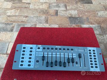 8 mini par LED 70 w cad, più macchina del fumo 1200W DMX e telecomandi, più centralina DMX, ulteriore centralina dimmer 4 canali 220 vca 4 Kw. fari alogeni da 500 w cad + cavi DMX.