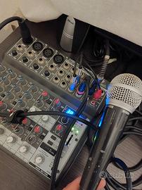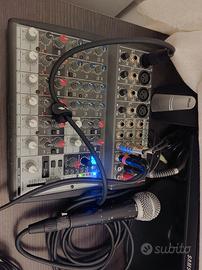 Vendesi kit karaoke con cassa amplificata con piedistallo, mixer, un microfono wifi rca e uno fisso shure e cavetteria.