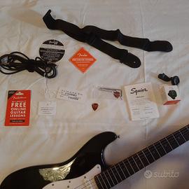 Vendo kit chitarra elettrica Fender Squier Stratocaster usata poche volte poi abbandonata per qualche mese con tutti gli accessori pari al nuovo .Possibilità di spedizione.