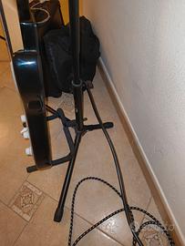 Vendo questo misto di accessori per chitarra elettrica. Gli accessori sono la chitarra elletrica Rocktile, un leggio musicale, plettri per chitarra, cassa per chitarrae corde per chitarra.