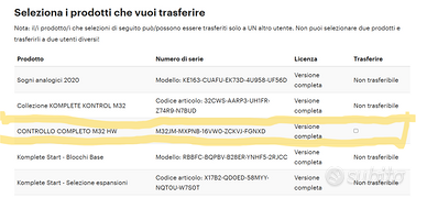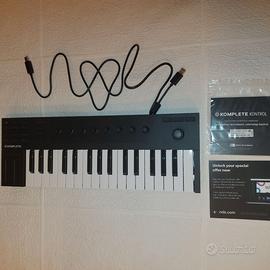 Suite di strumenti musicali ed effetti per la produzione musicale; usata pochissimo come nuova, provvista di imballo originale. In sintesi: •Tastiera controller micro per tutti i tuoi strumenti ed effetti virtuali •Punto d'ingresso accessibile nel mondo NI •Keybed NI custom •Display OLED informativo per navigare a colpo d'occhio •8x Manopole di controllo sensibili al tocco •2x Touch Strip per un'espressività intuitiva •Encoder a quattro direzioni per la navigazione audio e dei progetti con una sola mano •Navigazione preimpostata basata su tag tramite il software Komplete Kontrol: trova i suoni e ascolta le anteprime istantaneamente •Smart Play: Mantiene la tonalità con oltre 100 scale e modalità, riproduci progressioni di accordi e arpeggi con singoli tasti o esegui il mapping di qualsiasi scala sui tasti bianchi •Controllo pre-mappato di strumenti ed effetti Komplete più centinaia di plug-in Native Kontrol Standard (NKS) tramite il software Komplete Kontrol •Espandi la tua libreria con loop e campioni da Sounds.com •Supporto completo VSTi e VST FX •Integrazione profonda con il software MASCHINE •Controllo intuitivo su Logic Pro X, GarageBand e Ableton Live •Ingresso pedale TRS, assegnabile al sustain •Bus USB 2.0 •Può essere usato come controller MIDI •Include strumenti ed effetti Komplete, Komplete Kontrol, Maschine Essentials (software completo più 1.6GB di sample Maschine Factory, loop e strumenti) e Ableton Live 10 Lite •Dimensioni: 475 x 167 x 50mm •Peso: 1,45kg