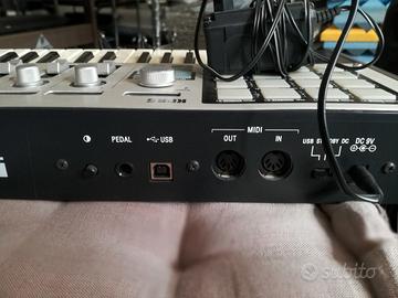 Compatta tastiera-controller MIDI, fornita di ben 35 diversi tipi di controller. Grazie alle sue dimensioni compatte ed al design innovativo, il microKONTROL stabilisce i nuovi standard qualitativi e funzionali per gli strumenti della sua categoria. Oltre alla mini-tastiera a 37 note sensibile alla velocity, il microKONTROL è dotato anche di otto blocchi encoder/cursore, sedici pad, un joystick a 5-vie assegnabile con switch e supporto per i pedali, per un totale di ben 35 controller differenti. Tastiera: 37 Note (mini-tastiera con velocity ed 8 tipi di curve di velocity). Encoder x 8. Cursore x 8. Pad x 16 (modalità velocity o costante). Joystick (a 5-vie, incluso lo switch). Manopola [Value]. Display principale: LCD retroilluminato a 8 caratteri (8x5 punti) con 3 segmenti. Display secondario x 8: LCD retroilluminato a 8 caratteri (8x5 punti) con 3 segmenti. LED Tempo. Locazioni di Memoria Preset (User): 12. Memoria Global. Switch a Pedale/Pedale Damper. MIDI: IN, OUT. Porta USB. Alimentazione DC 9 V (adattatore CA incluso), sei batterie AA o tramite bus USB. Dimensioni: 521(L) x 231(P) x 67(H) mm. Peso: 2.5kg. Completa di scatola e alimentatore originali. Come nuova, completamente funzionante, usata pochissimo in studio e in ottimo stato di conservazione. Vendo per inutilizzo. Merce testabile e ritirabile presso lo studio di Ponsacco (Pisa). Spedizione e/o trasporto a carico dell'acquirente. Contattare Marco al 347.3000.281