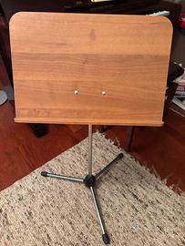 Leggio da orchestra in legno con struttura in metallo richiudibile per renderlo compatto quando non si usa.