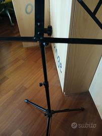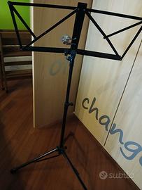 bello e pratico leggio in metallo verniciato nero per spartito musicale o altro uso, completamente richiudibile con regolatori per altezza, supporti a terra e inclinazione del leggio, bello e ben fatto.solo poste it e BRT