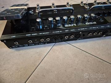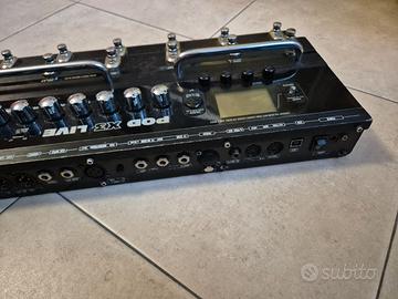 Pod X3 Live di Line 6 - Pedaliera multieffetto per chitarra. Interfaccia USB per PC, funge da SCHEDA AUDIO; si possono creare catene di suono dalla pedaliera o dal PC, o può essere usata come semplice multi-effetto. Dispone di 78 emulazioni di ampli e 24 cabinet. Può essere collegata direttamente all'impianto dalle uscite bilanciate, è possibile collegare tramite Cannon anche un microfono sfruttando gli effetti dedicati alla voce.