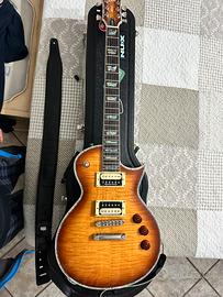 Vendo chitarra elettrica LTD EC1000 Deluxe Amber Sunburst in condizioni eccellenti. Unica modifica (a vantaggio!!!) l'applicazione del capotasto in osso (e relativo set-up). Top: Acero fiammato Body: Mogano Manico: Mogano 3-pezzi Costruzione: Set-Thru Scala: 24.75" (628,65mm) Profilo: Thin U Tastiera: Ebano Capotasto: 42mm Tasti: 24 Extra Jumbo in acciaio Intarsi: Bandiere, abalone Raggio: 350mm Hardware: Cromato Meccaniche: LTD Locking (autobloccanti) Ponte/Cordiera: TonePros Tune-O-Matic con cordiera Stopbar Pickup al ponte: Seymour Duncan JB Pickup al manico: Seymour Duncan '59 Controlli: 2x Volume, Tono (push/pull - splittabile), Selettore pickup 3-Vie Finitura: Amber Sunburst Made in Indonesia Vendo con custodia RIGIDA, muta corde, tracolla Preferibilmente consegna a mano zona Frascati/Rocca Priora (Rm). Eventuale spedizione a carico (e rischio) acquirente. Prezzo NON TRATTABILE. No permute.