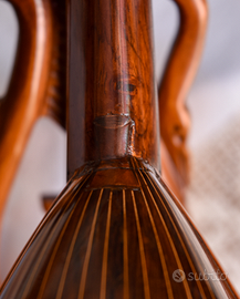Manico in acero, tastiera nuova in palissandro, cassa armonica in palissandro, tavola armonica in abete. Intarsi centrali e laterali in madreperla.