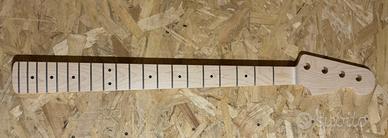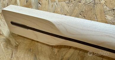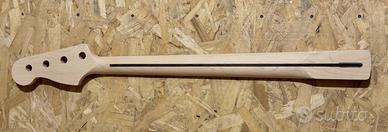 Manico per Precision Bass di Liuteria (misure per American standard, Japan, Mex etc), costruzione pezzo unico di Canadian hard maple, scala 34", radius 9,5", 20 tasti in acciaio medium jumbo, trussrod double action con regolazione Philips head sul tacco, da verniciare.