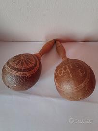 principali: Cassa di risonanza: Tradizionalmente ricavata da una zucca essiccata (come la Cucurbita lagenaria) o da una sfera di legno cava. Contenuto: All'interno sono riempite con semi secchi, sassolini o chicchi (come riso o mais) che producono il suono tipico quando vengono scossi. Impugnatura: Un manico in legno che attraversa o sostiene la sfera per permetterne l'uso ritmico. Storia e Utilizzo Originarie delle popolazioni indigene del Sudamerica e dei Caraibi, le maracas sono diventate fondamentali in generi cubani come il Son, la Rumba e la Salsa. I musicisti che le suonano sono chiamati maraqueros e spesso usano maracas di dimensioni diverse per ottenere sfumature sonore differenti: quelle più piccole hanno un suono più delicato, mentre quelle grandi sono più nette e decise.