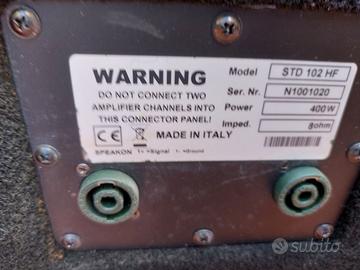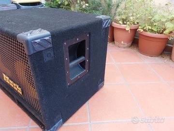 Cassa due per dieci 400W 8 ohm. Altoparlanti in neodimio, leggerissima. Tenuta sempre in casa, condizioni funzionali perfette, condizioni estetiche moquette solo un pò impolverata ma assolutamente priva di strappi o abrasioni. Cassa dalla risposta estremamente veloce per via degli altoparlanti Markbass B&C custom al neodimio, ma non si rinuncia a bassi da terremoto. Caratteristiche IMPEDANCE 8 ohm SPEAKER SIZE 2x10 in. BASS PORTS front TWEETER 1" compression driver with custom horn POWER HANDLING 400W RMS (AES Standard) CROSSOVER FREQUENCY 3.5 kHz FREQUENCY RESPONSE 40 Hz to 20 kHz SENSITIVITY 101 dB SPL. Spedizione da concordare.