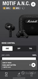 Vendo cuffie auricolari true wireless marca Marshall modello Motif A.N.C. (con riduzione attiva del rumore, app dedicata, varie configurazioni equalizzatore, regolazione soppressione rumore e funzione trasparenza), con tre misure di capsule in silicone, perfettamente funzionanti, pagate nuove 199 euro, nessun difetto estetico, nessun problema da segnalare
