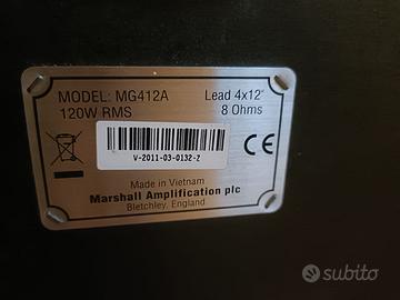 Vendo per inutilizzo, cabinet Marshall MG412A in perfette condizioni sia funzionali, sia estetiche. Usato solo in casa e a qualche festa di matrimonio. Potenza 120W RMS, impedenza 8 ohm. Consegna solo a mano, zona Mestre Venezia