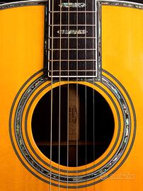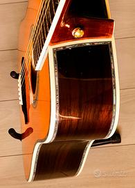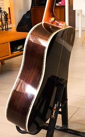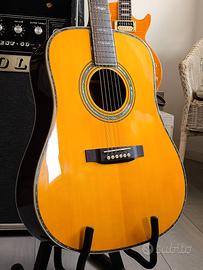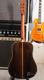 Strumento pari al nuovo, tastiera rettificata professionalmente, capotasto e ponte in osso. Top in Abete massello, fondo e fasce palissandro, manico mogano, meccaniche vintage style, sistema di pre-amplificazione interno a 3 pickup. E' una copia della Martin realizzata benissimo, con un ottimo suono dreadnought e una suonabilità ad altissimi livelli.