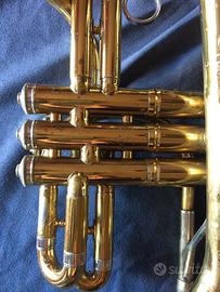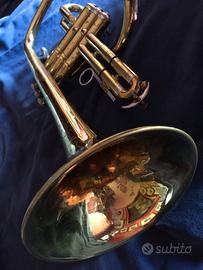 MARTIN FLUGELHORN modello IMPERIAL, splendido prodotto anno 1956 con numero seriale 201xxx, canneggio conico 0,472 ML , peso kg1,120, lunghezza cm 39,4, campana diametro cm 15,4, leadpipe da cornetta model Imperial, due chiavi per condensa, molle superiori, cilindri in acciaio, finitura lacca-cellulosa gold. con qualche separazione vista la longevità. la meccanica è notevole. suono incomparabile. strumento di altri tempi. no case.