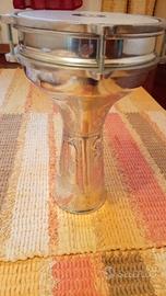 Strumento praticamente nuovo, utilizzato pochissimo. Ornamenti incisi stile turco, alluminio martellato a mano, pelle sintetica sostituibile (pelle di ricambio non inclusa). Dimensioni (D x A): 20,32 cm (8“), 36,19 cm (14 1/2”)