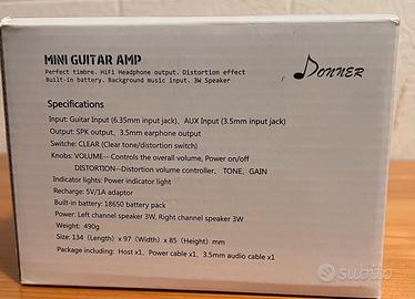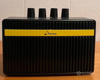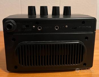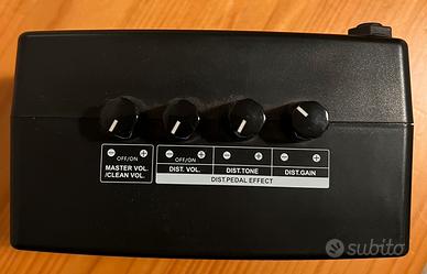 Vendo mini amplificatore per chitarra elettrica con cavo di ricarica usb e ingresso dispositivo audio aux (phone, altro) e uscita per cuffie. Clean e distorti. Ingresso jack per chitarra elettrica.