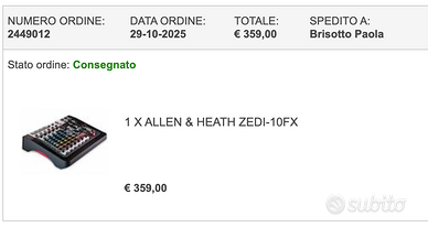 Vendo mixer analogico ALLEN & HEATH ZEDi-10FX per inutilizzo. Acquistato nuovo il 29 ottobre 2025 su Strumenti Musicali. L'ho utilizzato solo 2 volte. Garanzia valida fino a 29 ottobre 2027. Nessun difetto, nessun graffio. E' come nuovo. Vendo insieme a comodo case per il trasporto. Caratteristiche: Progettati per registrazioni, esibizioni e per le società di noleggio AV e installazione, i modelli ZEDi combinano un mixer compatto con un interfaccia 4×4 USB 96kHz a 24bit , che permette la registrazione multitraccia e la riproduzione su Mac, PC o un dispositivo iOS (utilizzando il Camera Connection Kit). Le unità hanno anche opzioni di routing della sorgente flessibile per adattarsi a diversi flussi di lavoro, e sono in bundle con il software di produzione musicale Cubase LE e l'app Cubasis LE di produzione mobile. Gli ZEDi-10 e ZEDi-10FX dispongono di 4 canali mono con ingressi XLR e TRS separati, un canale stereo ed un secondo ingresso stereo per i ritorni di riverbero o playback. I canali mono includono circuiti DI ad alta impedenza permettendo di collegare le chitarre direttamente nel mixer senza il costo ed il fastidio di trasportare DI box separate. Interfaccia Audio USB 4 In, 4 Out (24-bit / 96kHz) Software Cubase LE incluso App Cubasis LE inclusa 4 Ingressi Mic / Line con prese separata XLR e jack TRS 2 Ingressi Stereo con prese jack TRS 2 Ingressi DI ad alta impedenza per chitarra eliminano la necessità di DI box Motore FX interno con Tap Tempo Filtro Lo-Cut per ripulire indesiderati rumori a bassa frequenza EQ 3 bande Dimensioni: H97 x 333 x 274mm Peso: 2,2kg