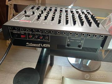 Mixer amplificato Minicompact LEM 8 canali (6+2 stereo) con equalizzazione a due bande + 2 casse passive LEM MP 150 (150 W continui) e impedenza per canale di 8 ohm, il tutto perfettamente funzionante seppur con lievi difetti estetici dovuti al tempo.