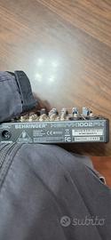 MIXER PASSIVO 10 INGRESSI CON EFFETTI Mixer 2 bus mic/line compatto e flessibile, provvisto di 2 canali con preamplificatori microfonici XENYX all'avanguardia. Progettati per applicazioni da studio e dal vivo, entrambi i mixer offrono un EQ neoclassico a 3 bande "British" con filtro passa-basso escludibile su tutti i canali mono. Inoltre è presente un processore FX stereo digitale integrato a 24 bit con 100 grandiosi preset pronti per l'uso. Caratteristiche principali Mixer di altissima qualità a 10 ingressi 2 Bus con Mic Preamp XENYX Alimentazione Phantom +48V 1 FX Send post fader per canale per dispositivi FX esterni Uscite Main Mix più control room separata, uscite cuffie e CD / Tape stereo Ingressi CD / Tape assegnabili al main mix o alle uscite control room / phone FX per controllare la funzione room aiuta a monitorare il segnale effetto attraverso le uscite cuffie e control room 4 Mic Preamp XENYX all'avanguardia EQ 3-bande "British" per un suono caldo e musicale Alimentatore incluso Dimensioni: H47 x 189x 220mm