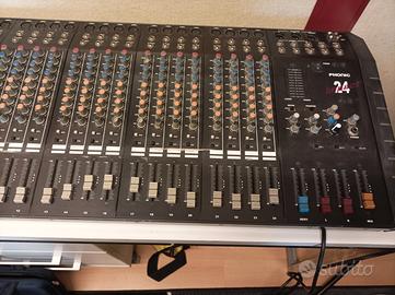 Mixer Phonic Impact 24 canali. Inutilizzato da oltre 8 anni se non per "arredo" o qualche volta per collegamento device esterni separati. MIXER PER MUSICA DAL VIVO E REGISTRAZIONE resistente a tutti i tipi di polvere e condizioni esterne, Possibilità di filtro automatico del sub bus con potenziometro di uscita mono sub bus 100 effetti Processore di effetti da 96 Khz, Ingresso microfonico bilanciato a 24 canali, opzione preamplificatore a bassissimo rumore. Ciascun canale dispone di canali di linea e di insert. 2 ingressi stereo e connessioni insert su canali mono, Uscite 2T, Taglio basso su canali mono, LED di picco, EQ a 3 bande, almeno 4 controlli AUX, PFL e mute, Interruttore di alimentazione fantasma, Uscita mono extra, uscita cuffie con controllo di livello, Consente il monitoraggio dei segnali L/R, MONO, cuffie e AUX 1/2/3/4 con quattro indicatori di livello indipendenti, Sensibile alle frequenze comprese tra 20 e 100.000 Hz per ingressi microfonici,EQ a 3 bande con controllo della zona della frequenza centrale da 80 Hz (bassi), 2,5 kHz (medi) e 12 kHz (alti) e filtro taglia basso da 75 Hz (-18 dB/ott),Ha un rapporto S/N maggiore di 90 dB,A valori THD dello 0,01% o migliori,CMRR 80 dB, caratteristiche di diafonia superiori a 86 dB,Ha il certificato CE. Il mixer non viene usato da molti anni se non collegato con qualche strumento, microfono e dispositivo per test di funzionamento. Per questo motivo preferisco non spedire se non con vostro case, vostro corriere e ovviamente a responsabilità vostra per eventuali danni o malfunzionamenti dovuti al trasporto. Se interessati al ritiro, sarà possibile visionarlo e testarlo (con vostri strumenti appresso) direttamente in loco previo accordi.
