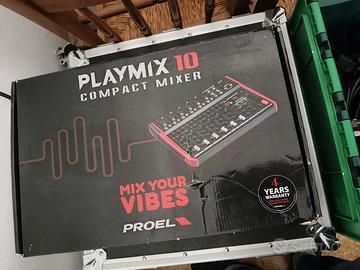 MIXER ANALOGICO 10 CANALI Playmix è una serie di mixer creati da Proel per offrire in un formato molto compatto e attraente un'alta densità di ingressi, una serie completa di funzioni ed una qualità audio superiore, ad un livello di prezzo molto conveniente. I mixer Playmix sono disponibili in 3 modelli, con le stesse funzioni di canale e master, ma con 6, 8 e 10 canali rispettivamente. I canali mono Mic/Line includono preamplificatori microfonici a basso rumore e ad alta dinamica, equalizzatori a tre bande con MID parametrici e filtro HPF, e fader da 60 mm per un controllo completo del suono. Tutti i modelli sono dotati di un'avanzata sezione digitale con display LCD, che comprende: un DSP integrato a 24 bit di alta qualità, con 100 preset da studio di effetti singoli e combinati (Riverbero, Delay, Modulazioni) un'interfaccia audio USB stereo a 48kHz per la riproduzione/registrazione tramite connessione al PC, un lettore MP3 integrato dalla chiave di memoria USB o dall'interfaccia Bluetooth, registrazione stereo su chiave di memoria USB. Accuratamente progettati e ingegnerizzati in Italia da Proel, i mixer Playmix sono alloggiati in robuste scocche che garantiscono una lunga durata per un uso a prova di palcoscenico, e offrono in un formato ultracompatto le prestazioni di console professionali, con un suono pulito e preciso per una vasta gamma.